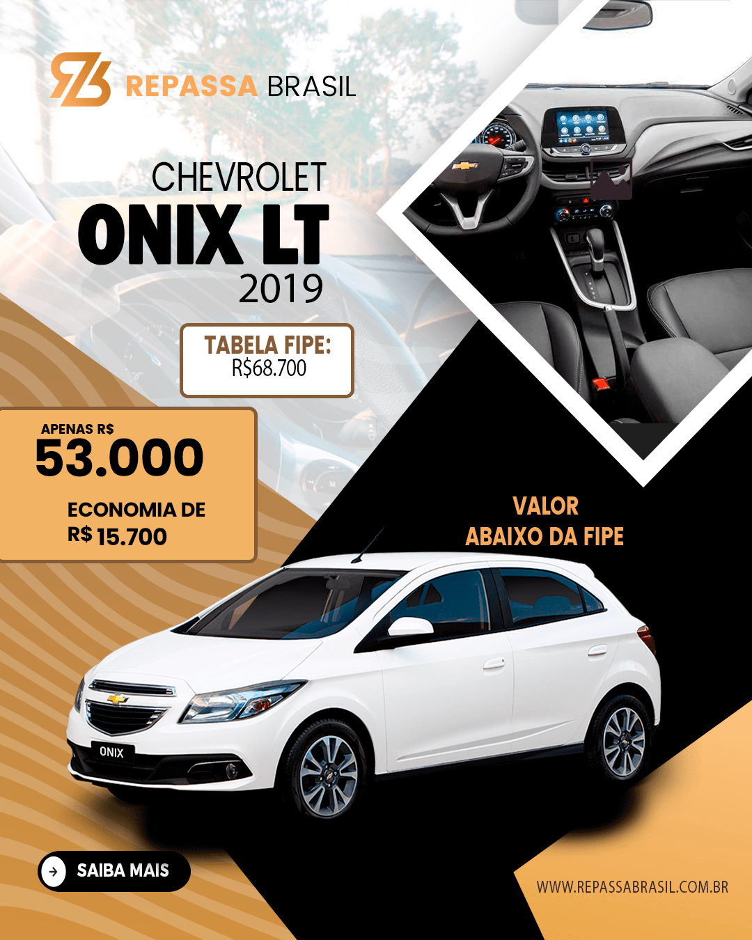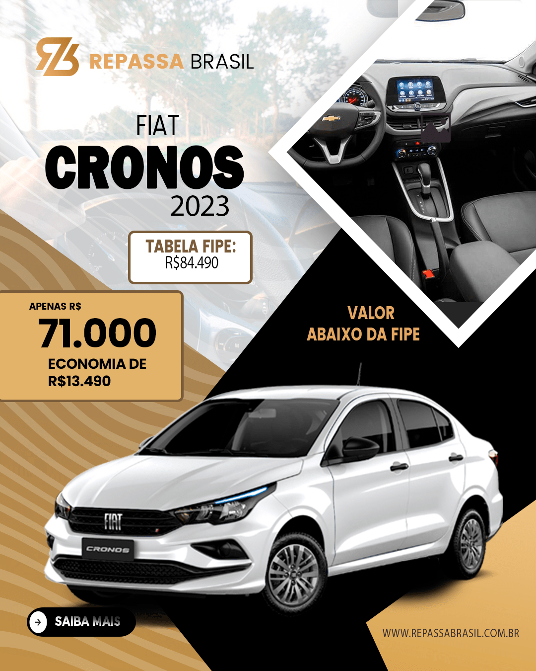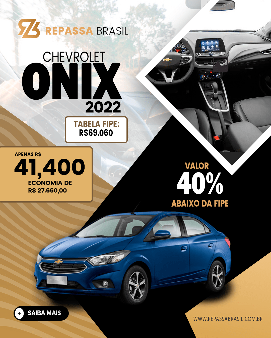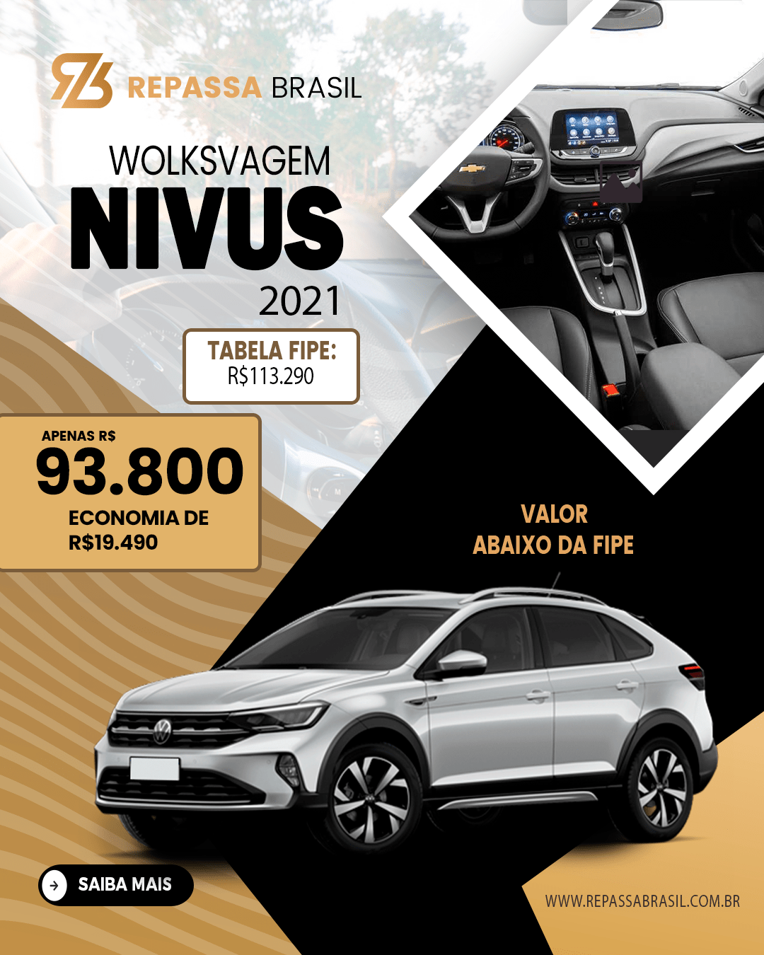 O REPASSA BRASIL garante a presença de veículos anunciados abaixo da tabela FIPE, PORÉM não é possível garantir um desconto mínimo ou uma quantidade mínima de carros com condições ÚNICAS. Os anúncios, as postagens no Feed e Stories das redes sociais entre outros meios de comunicação que possam ser usados para divulgação do Repassa Brasil, são meramente ilustrativos. As ofertas podem sofrer alterações sem aviso prévio. O REPASSA BRASIL é apenas um MARKETPLACE com ofertas selecionadas de concessionárias, POR ISSO não NOS RESPONSABILIZAMOS por nenhuma negociação, OBRIGADO!